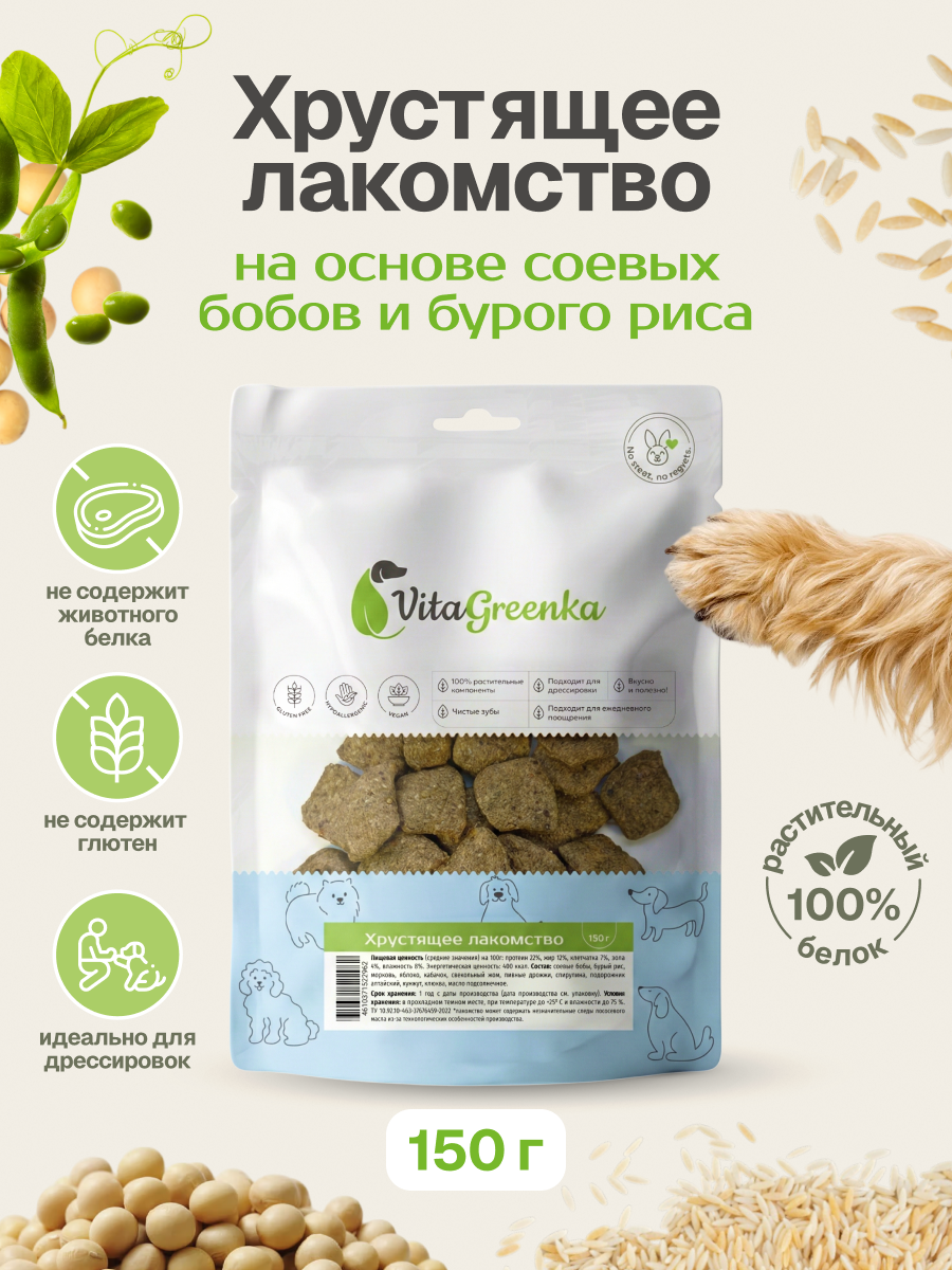 / Vitagreenka Хрустящее лакомство корм сухой растительный с соевыми бобами для собак, 150гр